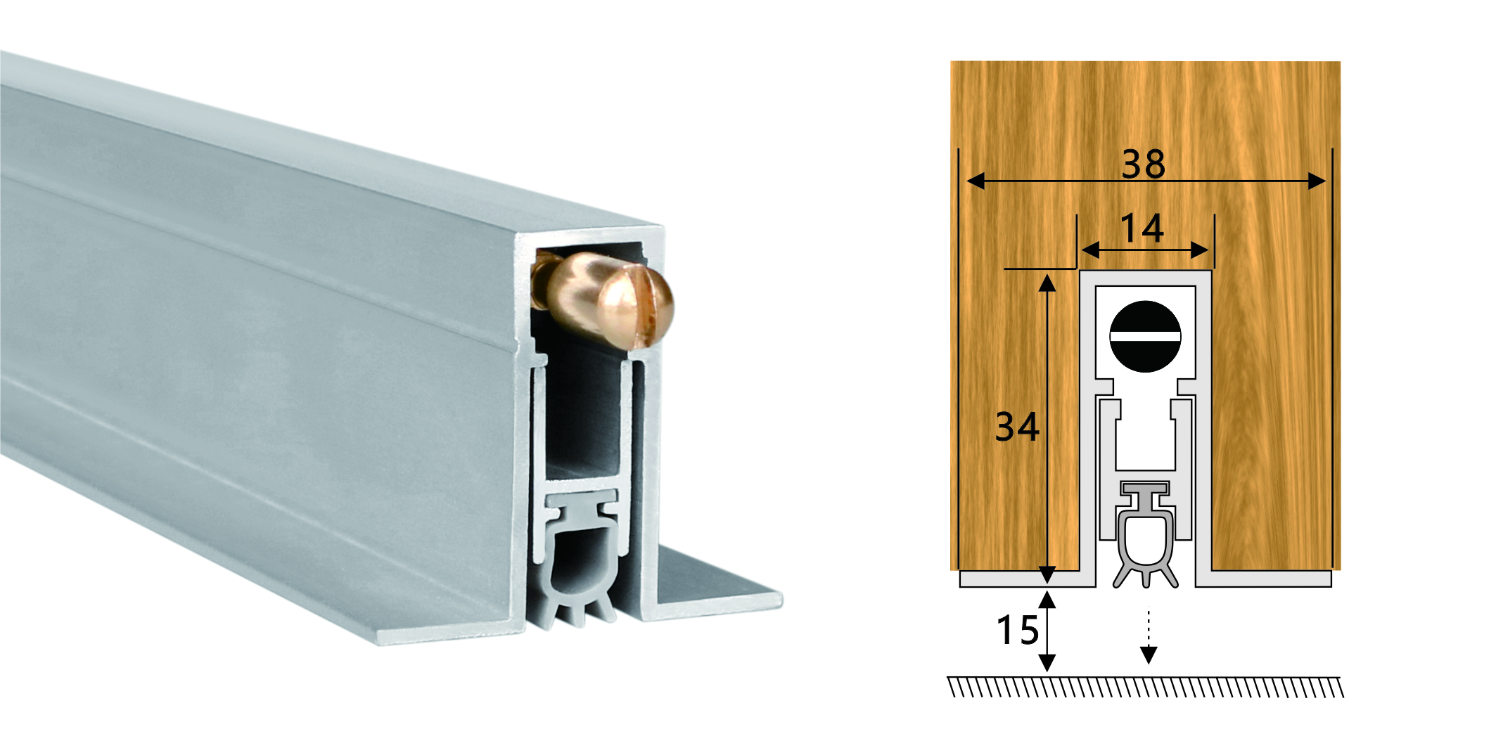 嵌入式門底自動升降式密封器,四連桿機(jī)構(gòu),適用于門扇內(nèi)開槽的門。安裝時需在門底有一個34mm*14mm的通槽,將產(chǎn)品放置其中,將兩端蓋板和密封器用螺絲固定(或用螺絲從密封條底部向上固定),使用本產(chǎn)品不影響門的整體風(fēng)格。