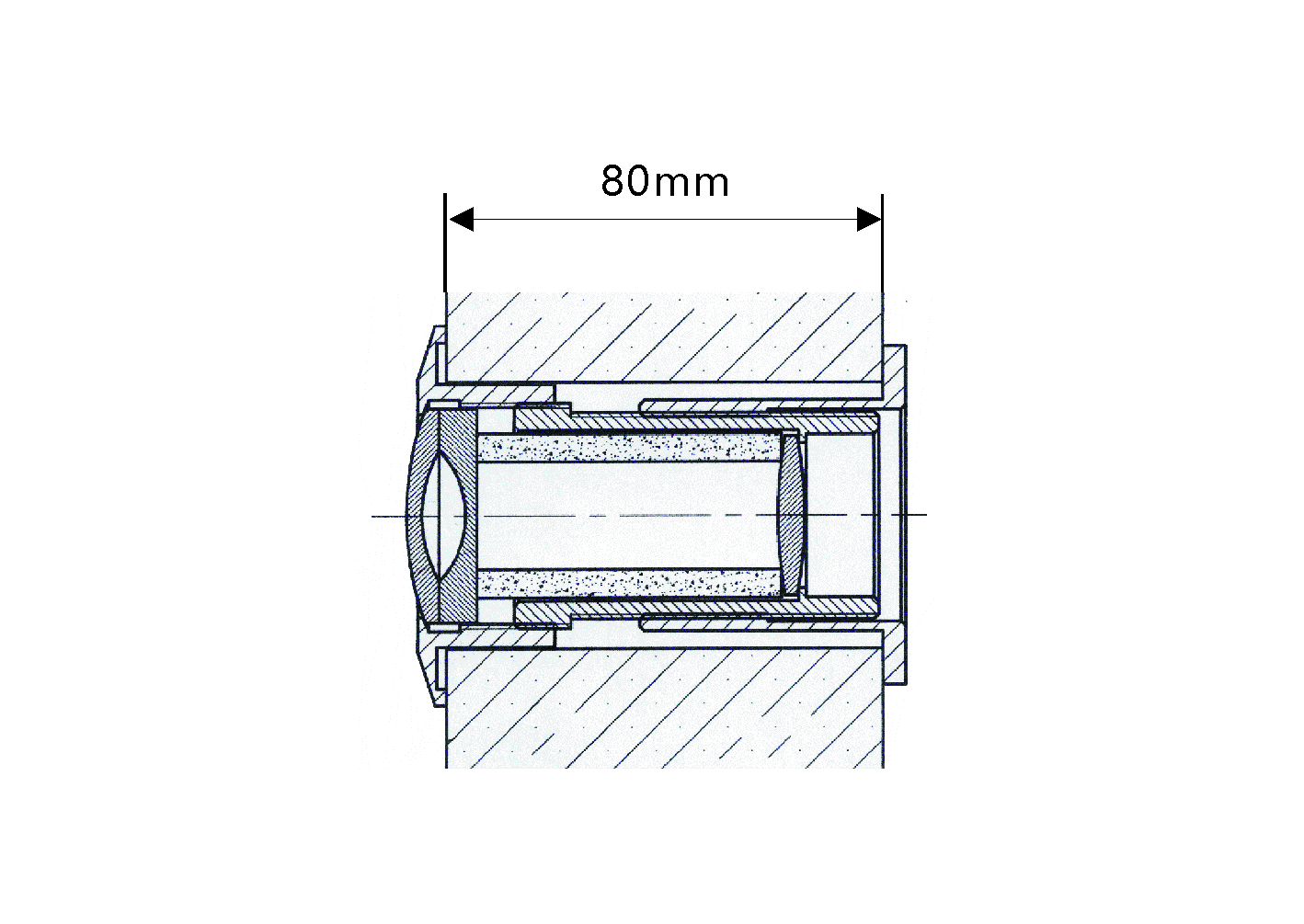 防火門鏡結構:防火門鏡由門鏡外套、門鏡芯套、門鏡內套、物鏡鏡片組、目鏡片(目鏡片安裝在芯套內) 組成,如圖1所示。(為不影響門鏡成像效果請不要隨意 拆裝門鏡各部件,否則將影響其光學效果)