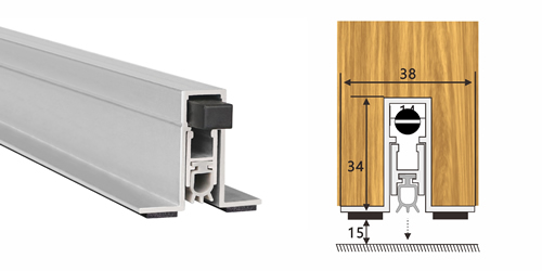 嵌入式防火門底自動升降式密封器,M型彈簧結構,適用于門扇內開槽的門。安裝時需在門底有一個34mm*14mm的通槽,將產品放置其中,從產品的翼上固定,并將裝飾端蓋板用螺絲裝上,使用本產品不影響門的整體風格。