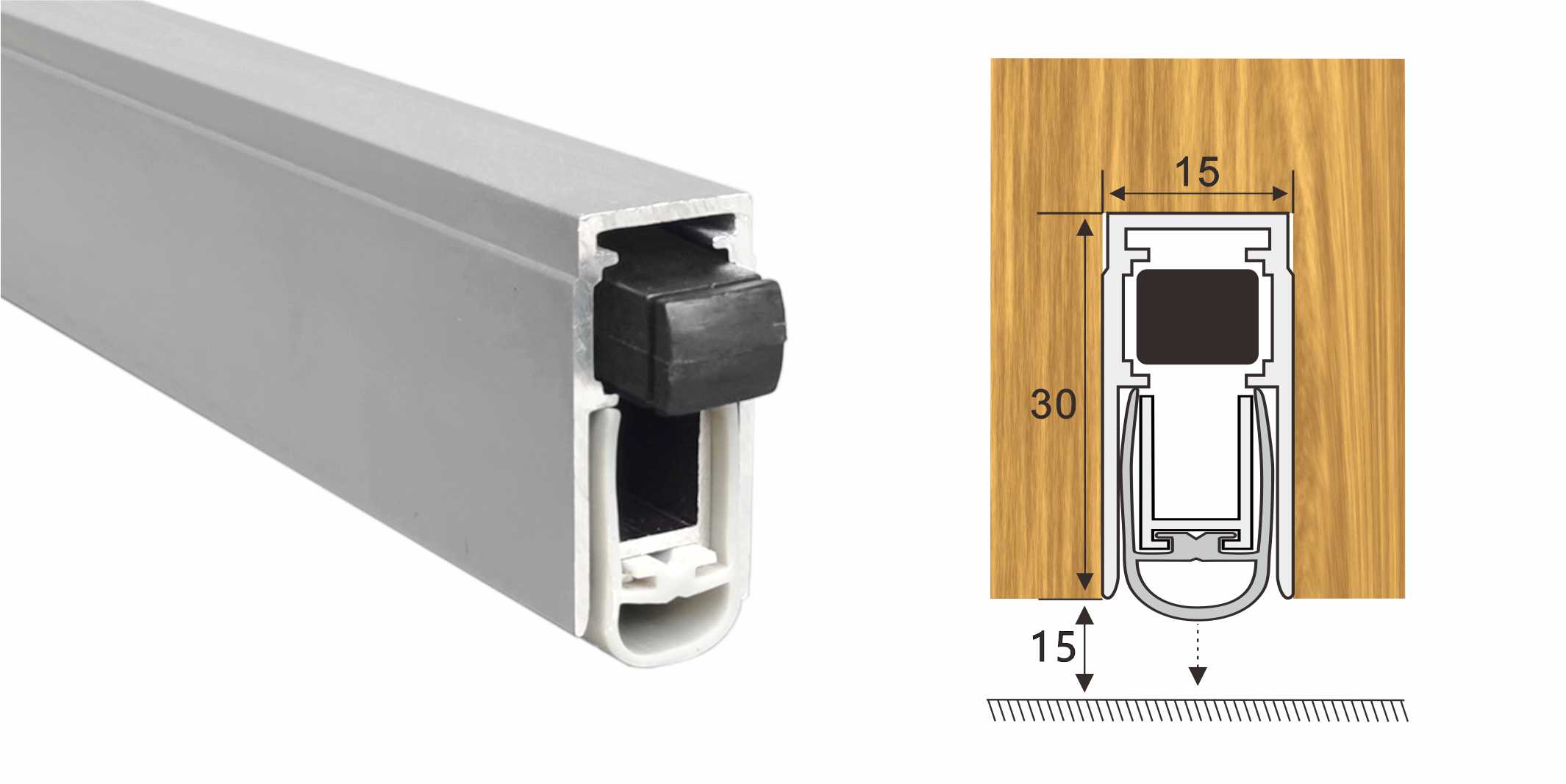 嵌入式門底自動升降式密封器,四連桿機構,適用于門扇內開槽的門。安裝時需在門底加工一條30mm*15mm的通槽,將產品放置其中,將兩端蓋板和密封器用螺絲固定,使用本產品不影響門的整體風格。