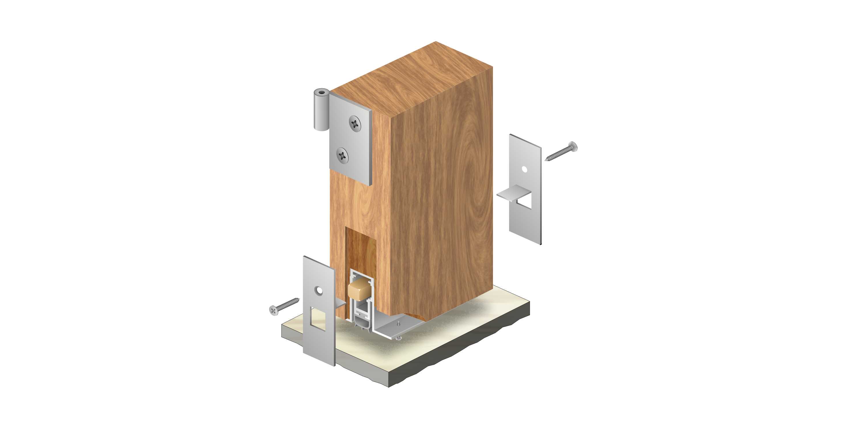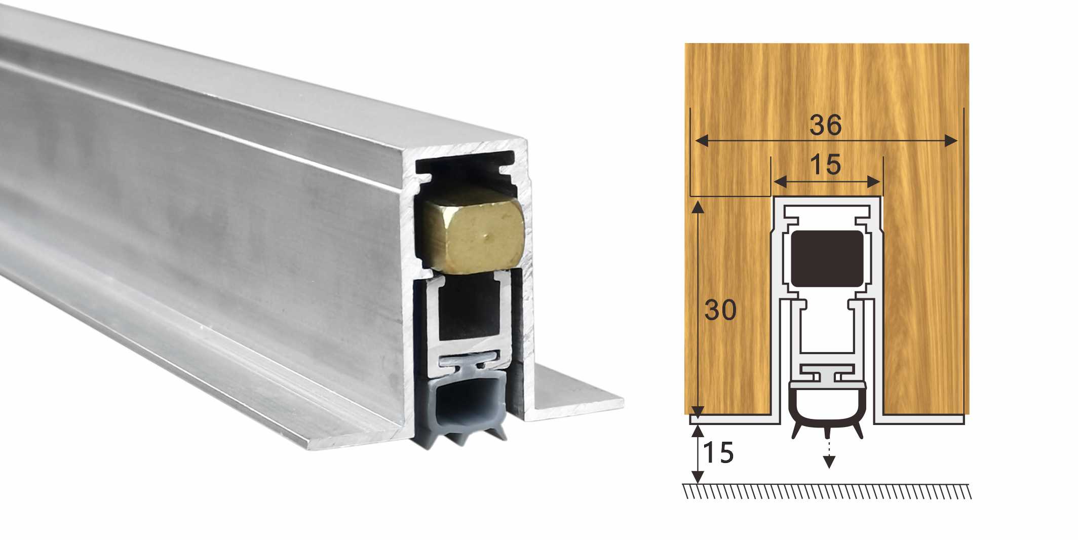 嵌入式門底自動升降式密封器,M型彈簧結構,適用于門扇內開槽的門。安裝時需在門底有一個30mm*15mm的通槽,將產品放置其中,將兩端蓋板和密封器用螺絲固定,使用本產品不影響門的整體風格。